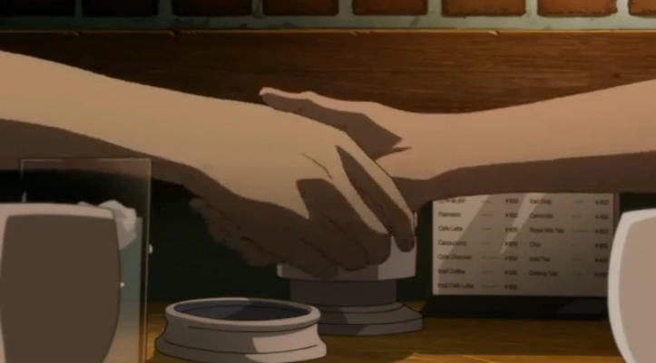 Kouichi and Izumi shaking hands.