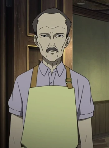 Kensaku made his debut in Episode 10 when he welcomed a part of 9th Grade Class 3 who came to the Yomiyama Shrine to pray for their safety, hoping this action would stop the calamity, along with Keiko, his wife. The class is accommodated at their restaurant-pension.